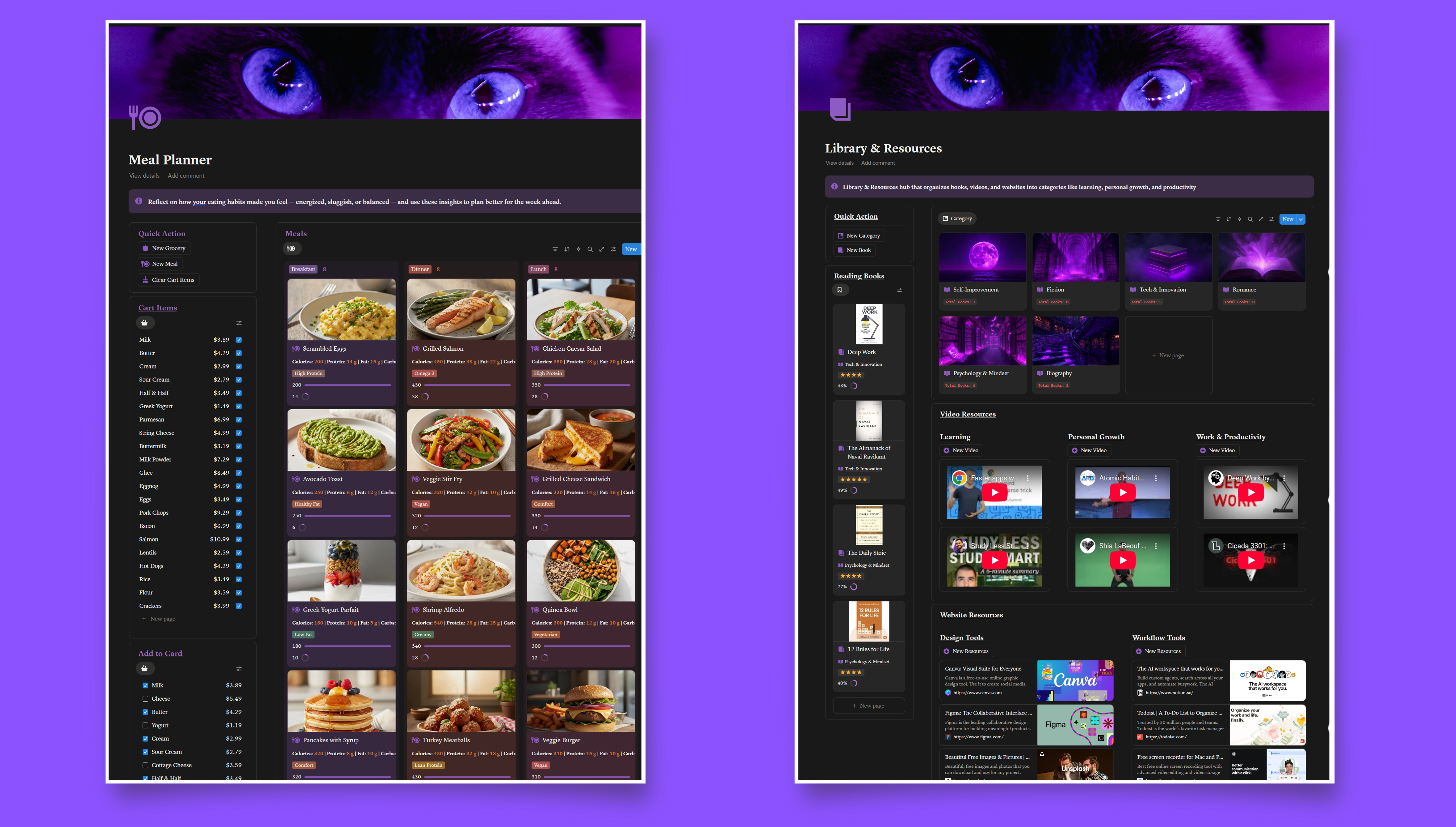 - Reading & Learning Hub – Track books, courses, and knowledge growth